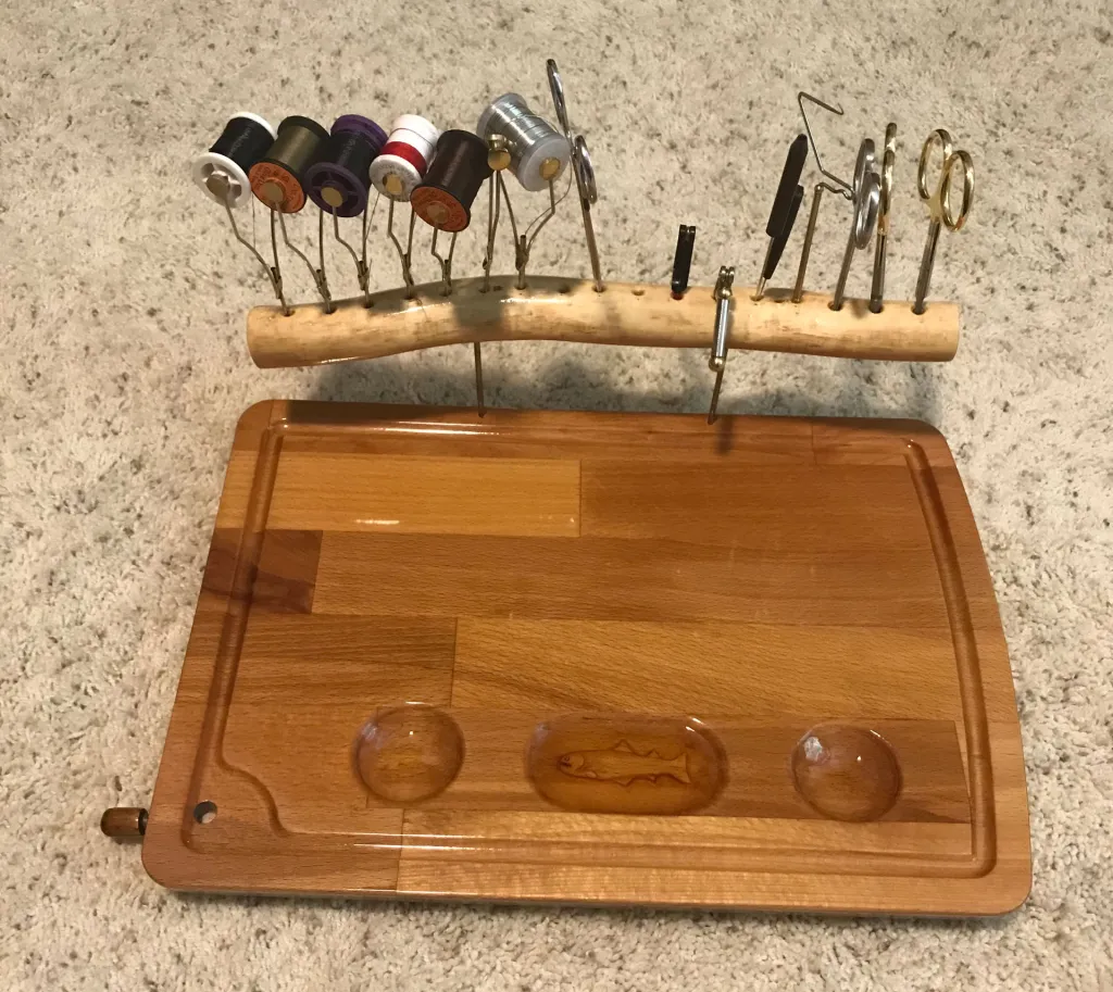 An IKEA cutting board turned lap tying bench with a few rudimentary tools and lost of elbow grease.
