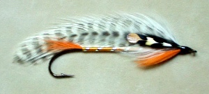 Tied by: Darren MacEachern Originated by: Gray Wolf Hook: Mustad 3907 B #4 Thread: White fwn Tag: Flat silver tinsel Tail: Orange schlappen fibers...