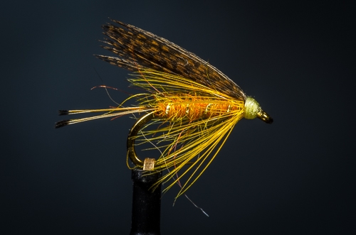 A sample photo of a Golden Olive wet fly taken with no diffuser in place. The light is a little harsh on top of the wing and on the head of the fly, but since the light is so focused on the fly itself, the background darkens dramatically and the fly jumps out of the image. I kind of like this. Care needs to be taken with exposure to ensure the fly is not blown out by the dark background. Always take a few test shots and check before shooting a bunch of flies.