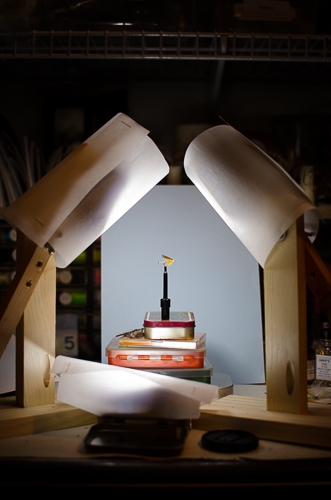 A simple three light setup using cheap LED lights with parchment paper diffusers and homemade wooden boom stands. They will not win any beauty contests, but they are functional, easy to use, and readily available at my tying desk.