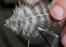 All the hackles can be made from one large grizzly feather. A large, saltwater style saddle can deliver the proper feather, but one might also be found on the sides and top of many of the coarser dry fly saddles. You need one or a couple of feathers with fairly long barbs, the longest ones being 1½ even 2 times the hook gape. As you work your way forwards on the hook, using parts of the feather closer to the tip, you get a natural taper to the fly, the final frontal hackle being quite small. The red dubbing and the red head offer some contrast, and if you use genuine seal’s fur, you even get the almost magic translucency and shine that’s found in this material. Light is caught and reflected in the material in a quite special way.