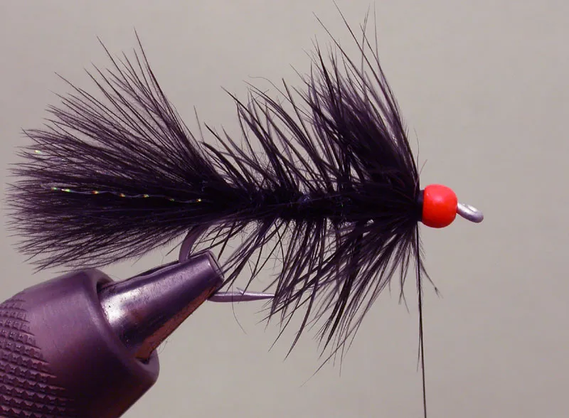 Secure the whole body with tying thread in big turns to the tail and back to the head. Make a secure head knot. I make this knot twice. It has to be really firm because of a intensive brushing step followed. Leave the thread as a safety, but keep it out of the way when brushing.